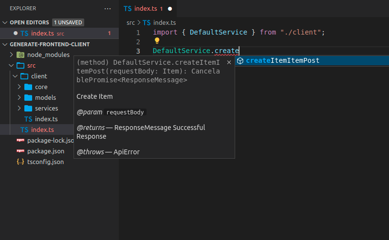 After generating the new client, you would now have clean method names, with all the autocompletion, inline errors, etc: